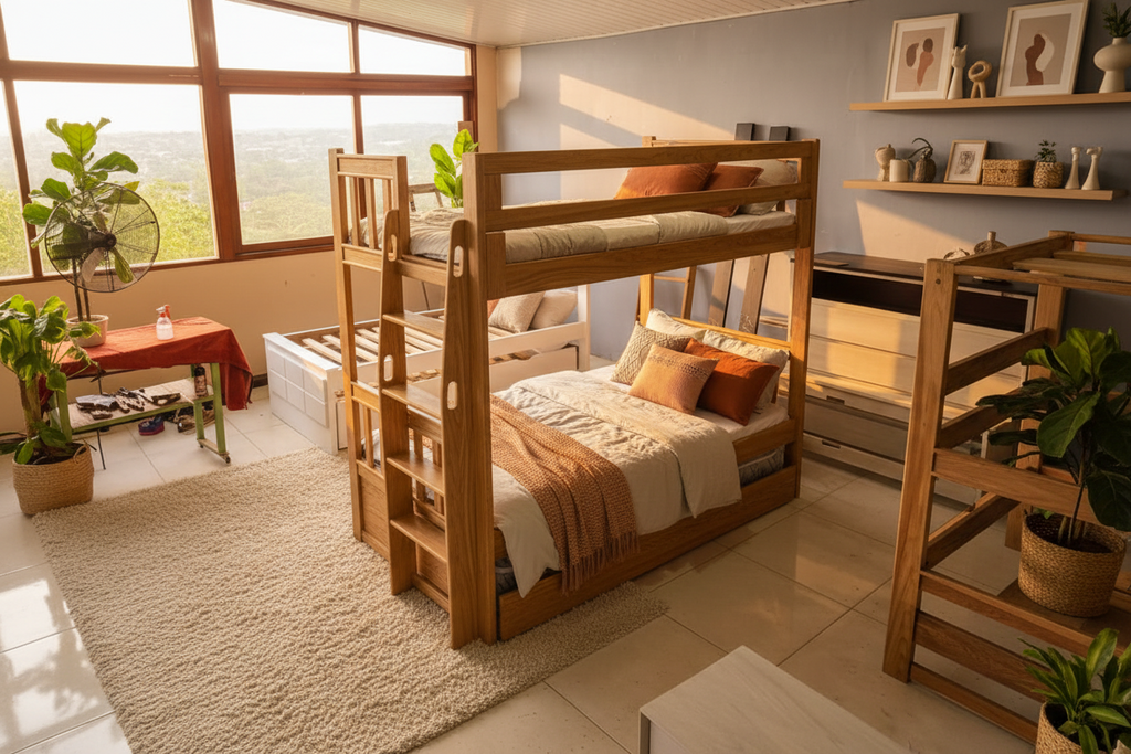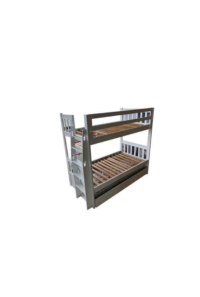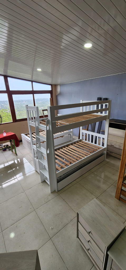 Camarote Sol en tamaño 3/4, 3/4 con gavetas auxiliares maximiza cualquier espacio que tengas en tu habitación sin perder versatilidad. Adiciona gaveteros auxiliares o cama auxiliar a tu conveniencia.
