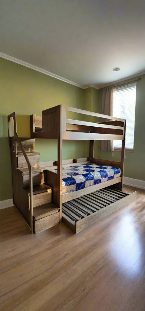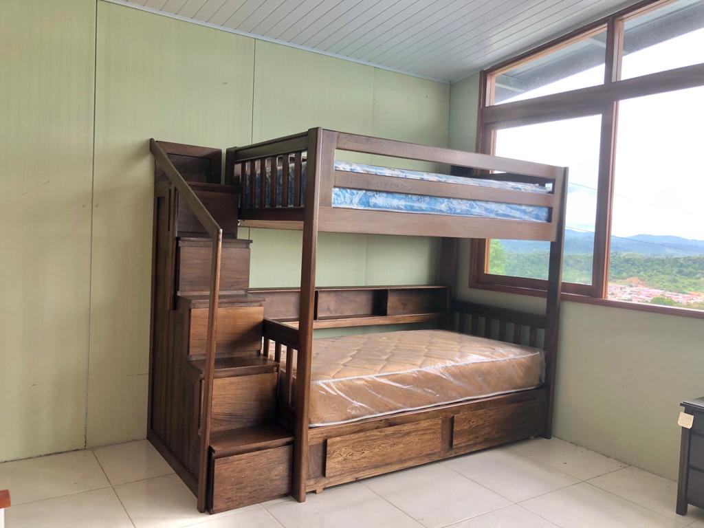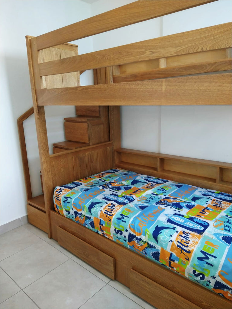 Camarote Luna en tamaño 3/4 & 3/4, cuenta con escalones con gaveteros para espacio extra. Ademas de tener fortaleza. Adiciona gaveteros auxiliares o cama auxiliar a tu conveniencia.
